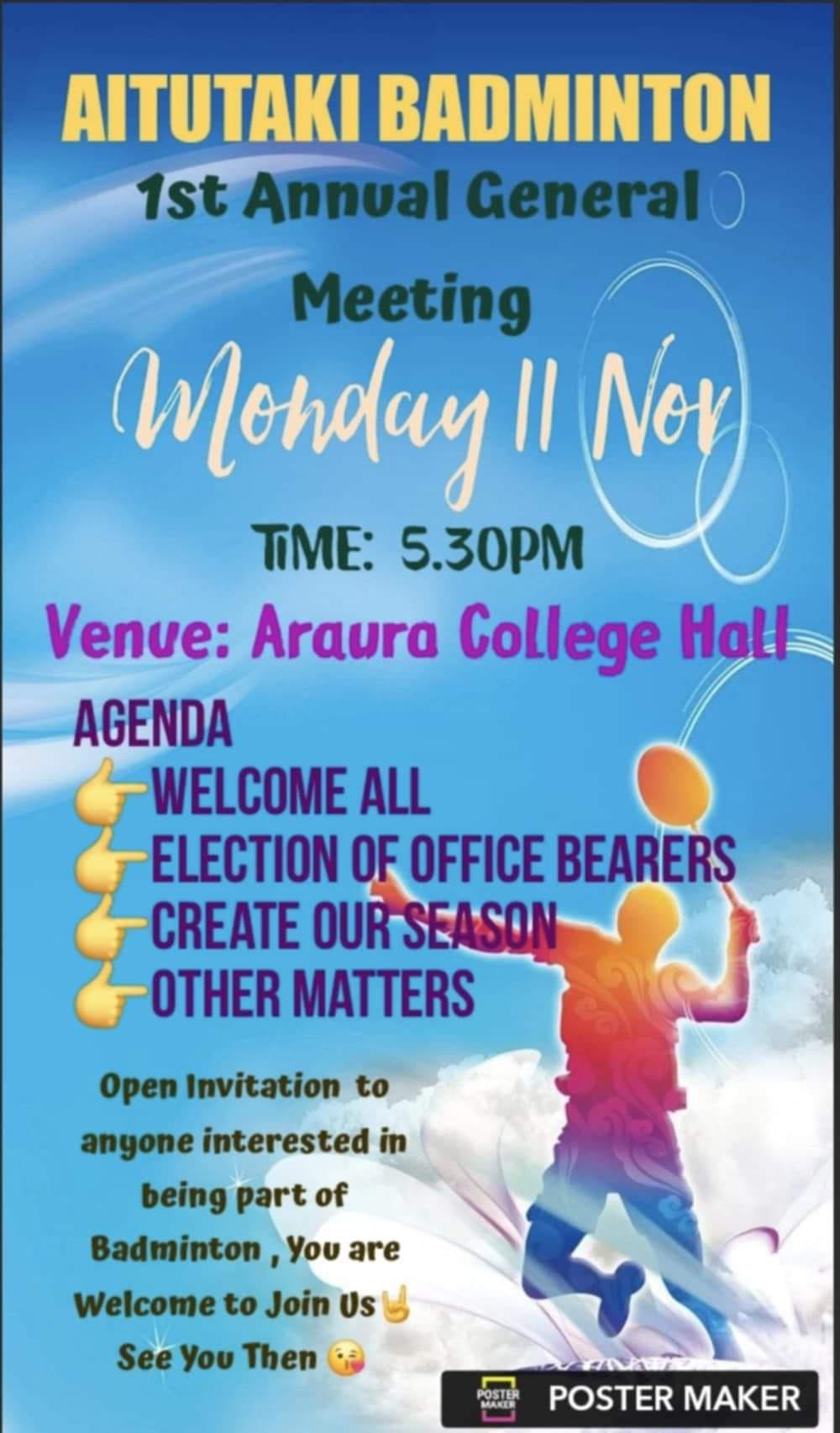 The Aitutaki Badminton Association is holding its first Annual General Meeting (AGM) on Monday, 11th November 2024. This meeting is a big step for the local badminton community, bringing together players, coaches, and fans who are excited to grow the sport on the island. They will discuss plans for future tournaments, community outreach, and training programs to help players of all ages improve their skills.